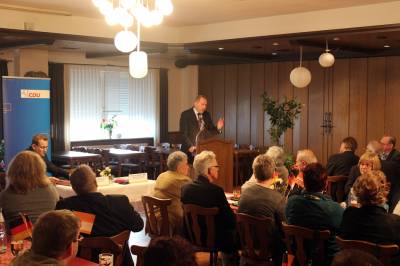 Alle Delegierten des Bezirksverbandes Ostfriesland versammelt, gemeinsam mit dem Bürgermeister Rikus Jager der niederländischen Gemeinde Westerveld (1.v.l.), dem Bezirksvorsitzenden Reinhard Hegewald aus Emden (5. v.l.) der Bundestagsabgeordneten Gitta Connemann MdB aus Leer (7. v.l.) und dem Landesvorsitzenden der niedersächsischen CDU, David McAllister, MdEP (10. v.l.)